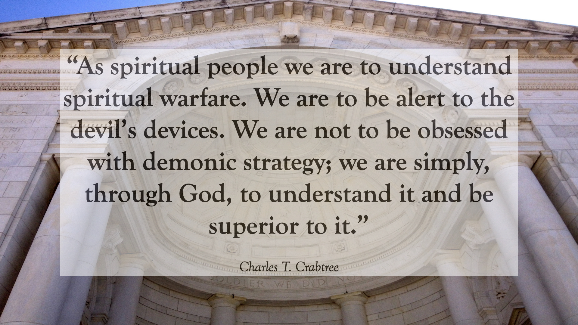 Charles T. Crabtree wrote, “As spiritual people we are to understand spiritual warfare. We are to be alert to the devil’s devices. We are not to be obsessed with demonic strategy; we are simply, through God, to understand it and be superior to it.”