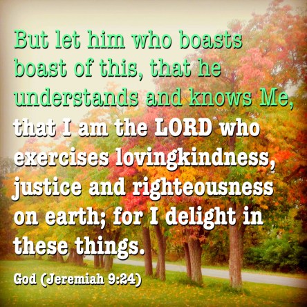 This is what the LORD says: “Let not the wise man boast of his wisdom or the strong man boast of his strength or the rich man boast of his riches, but let him who boasts boast about this: that he understands and knows Me, that I am the LORD, who exercises kindness, justice and righteousness on earth, for in these I delight,” declares the LORD.