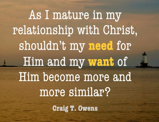 But as I mature in my relationship with Christ, shouldn’t my need for Him and my want of Him become more and more similar? Shouldn’t the deepest longing (want) in my heart be for the one thing I need most?