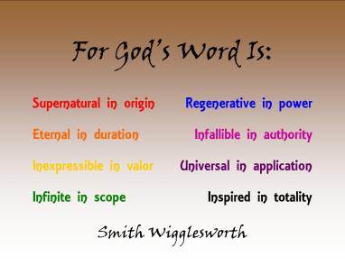 “Never compare this Book with other books. Comparisons are dangerous. Never think or say that this Book contains the Word of God. It is the Word of God. It is supernatural in origin, eternal in duration, inexpressible in value, infinite in scope, regenerative in power, infallible in authority, universal in application, inspired in totality. Read it through. Write it down. Pray it in. Work it out. And then pass it on.” —Smith Wigglesworth