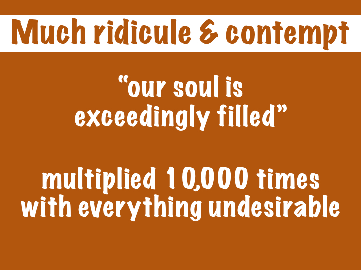 These are not words which the songwriter could easily brush off. One translation says, “our soul is exceedingly filled with the scorning” of these ridiculing people. In other words, it’s not something he could just brush off by thinking, “They don’t know what they’re talking about.”