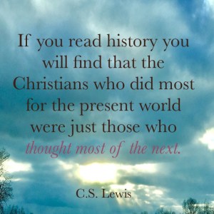 “If you read history you will find that the Christians who did most for the present world were just those who thought most of the next. The Apostles themselves, who set on foot the conversion of the Roman Empire, the great men who built up the Middle Ages, the English Evangelicals who abolished the Slave Trade, all left their mark on Earth, precisely because their minds were occupied with heaven. It is since Christians have largely ceased to think of the other world that they have become so ineffective in this.” —C.S. Lewis