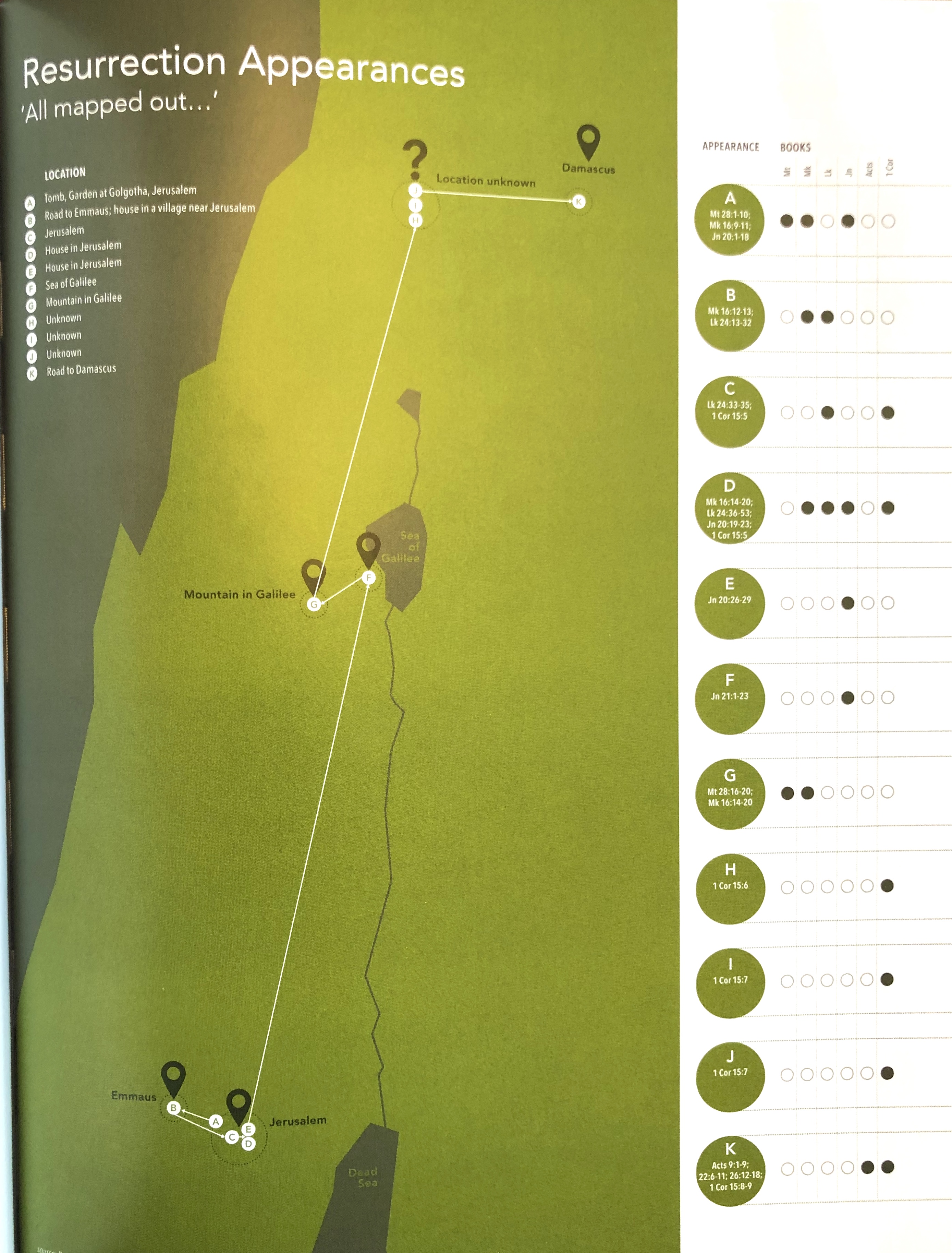 The appearances of Jesus after His resurrection aren’t just limited to the four Gospels (Matthew, Mark, Luke, and John), but also in the books of Acts and 1 Corinthians. Check out this infographic from The Infographic Bible by Karen Sawrey.