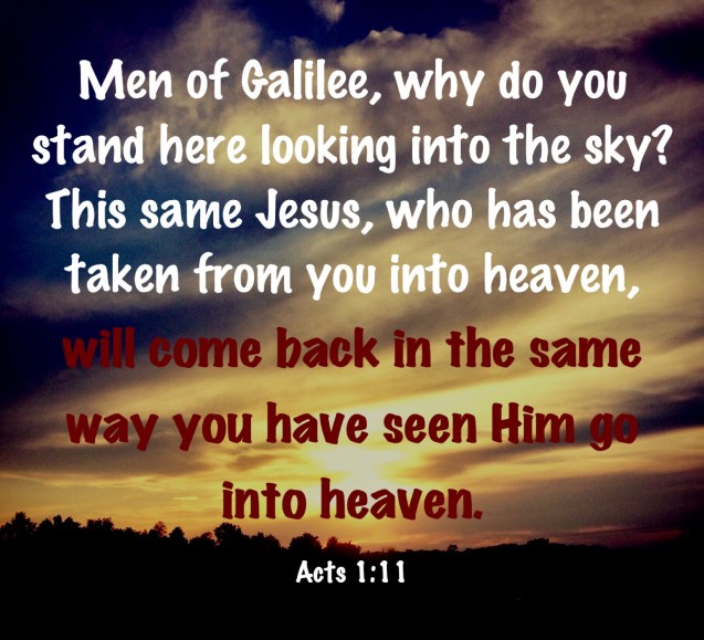 They were looking intently up into the sky as he was going, when suddenly two men dressed in white stood beside them. “Men of Galilee,” they said, “why do you stand here looking into the sky? This same Jesus, who has been taken from you into heaven, will come back in the same way you have seen Him go into heaven.” (Acts 1:10-11)