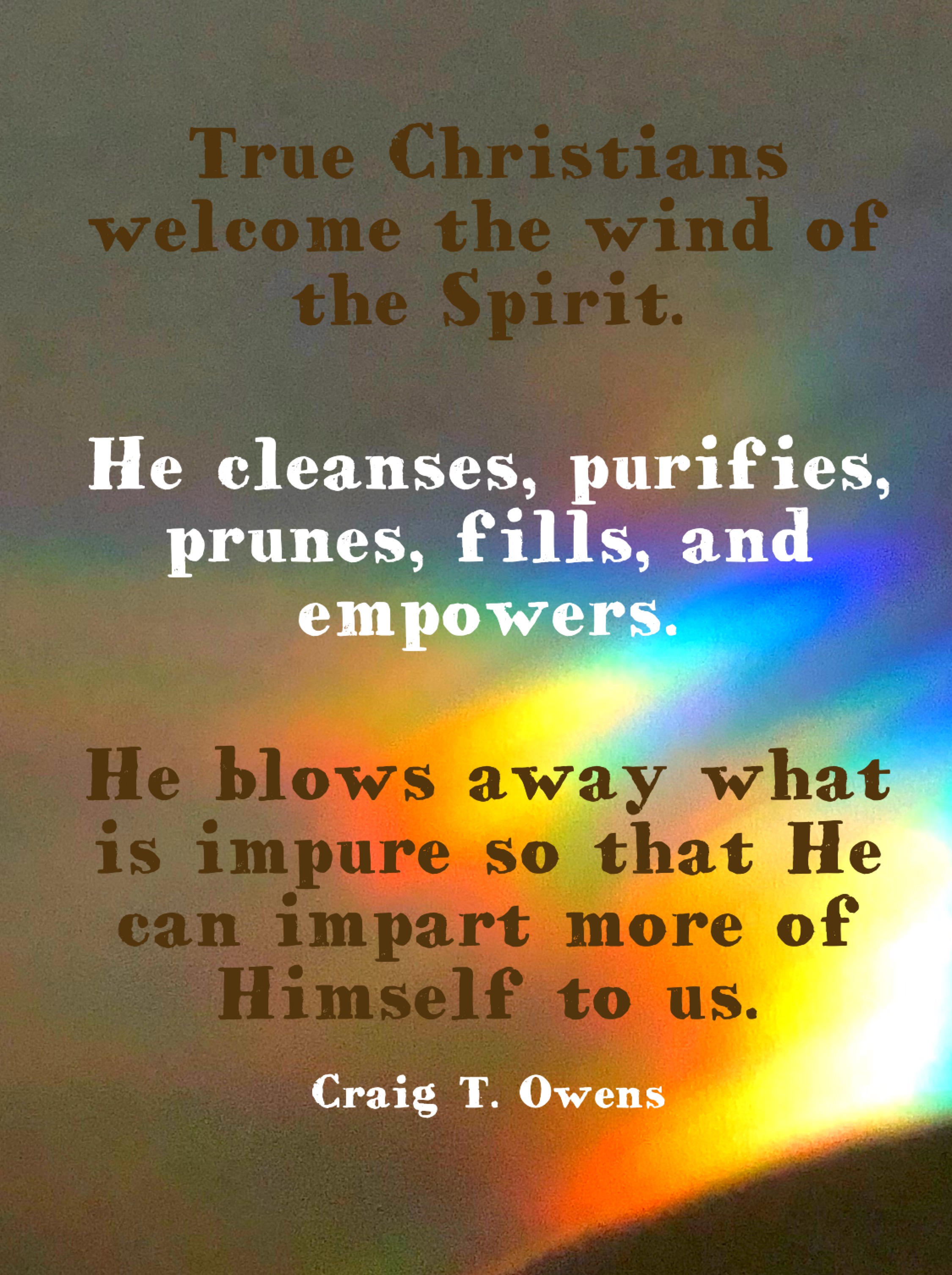 True Christians welcome the wind of the Spirit. He cleanses, purifies, prunes, fills, and empowers. He blows away what is impure so that He can impart more of Himself to us.