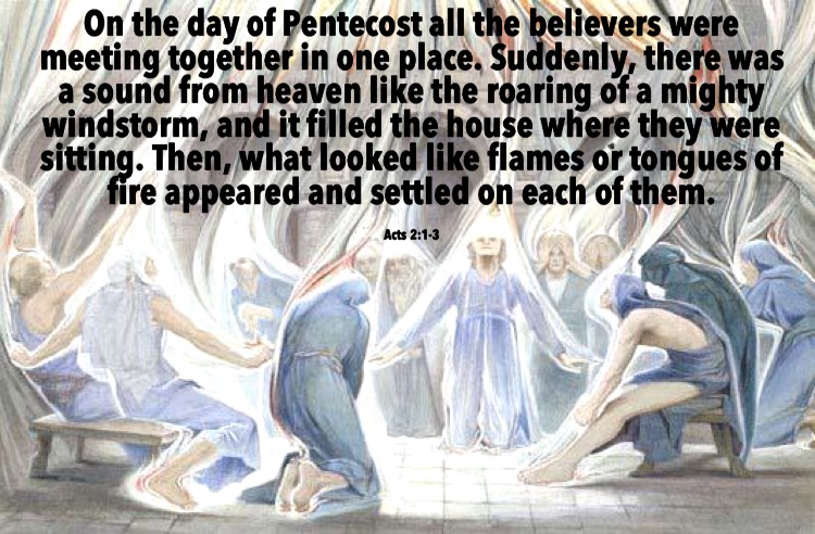 On the day of Pentecost all the believers were meeting together in one place. Suddenly, there was a sound from heaven like the roaring of a mighty windstorm, and it filled the house where they were sitting. Then, what looked like flames or tongues of fire appeared and settled on each of them. (Acts 2:1-3)