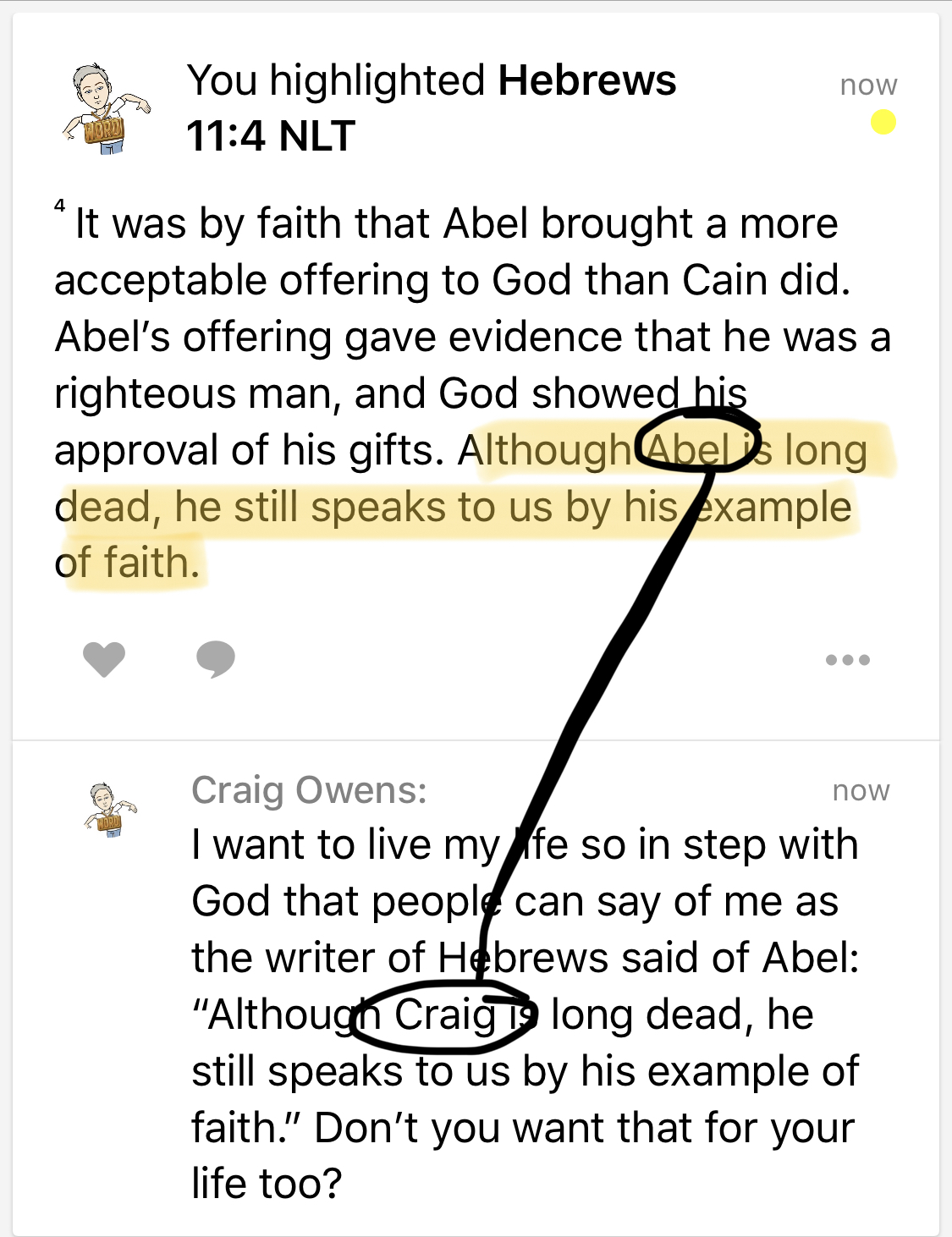 I commented on Hebrews 11:4 on YouVersion, “I want to live my life so in step with God that people can say of me as the writer of Hebrews said of Abel: ‘Although Craig is long dead, he still speaks to us by his example of faith.’ Don’t you want that for your life too?”