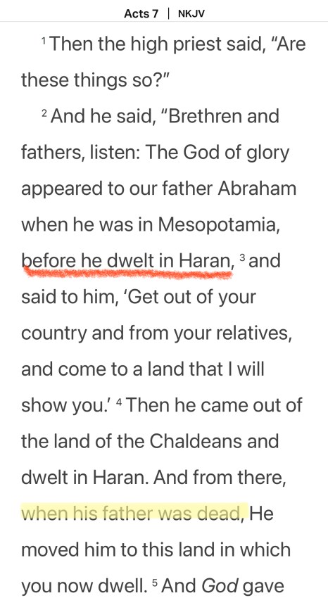 Stephen said that Abraham left Haran “after the death of his father” (Acts 7:4). But let’s do the math: Terah was 70 years old when Abraham was born and lived to be 205 years old (Genesis 11:26), but Abraham arrived in Canaan when he was 76 years old (Genesis 16:3, 16). That means that Terah was still physically alive when Abraham left him.