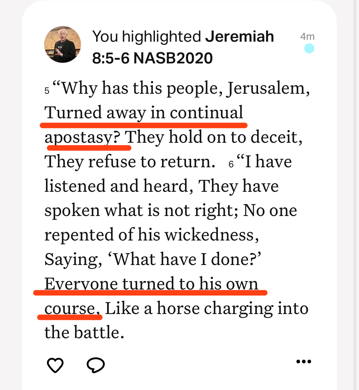 Why has this people, Jerusalem, turned away in continual apostasy? They hold on to deceit, they refuse to return. I have listened and heard, they have spoken what is not right; no one repented of his wickedness, saying, “What have I done?” Everyone turned to his own course, like a horse charging into the battle. (Jeremiah 8:5-6)