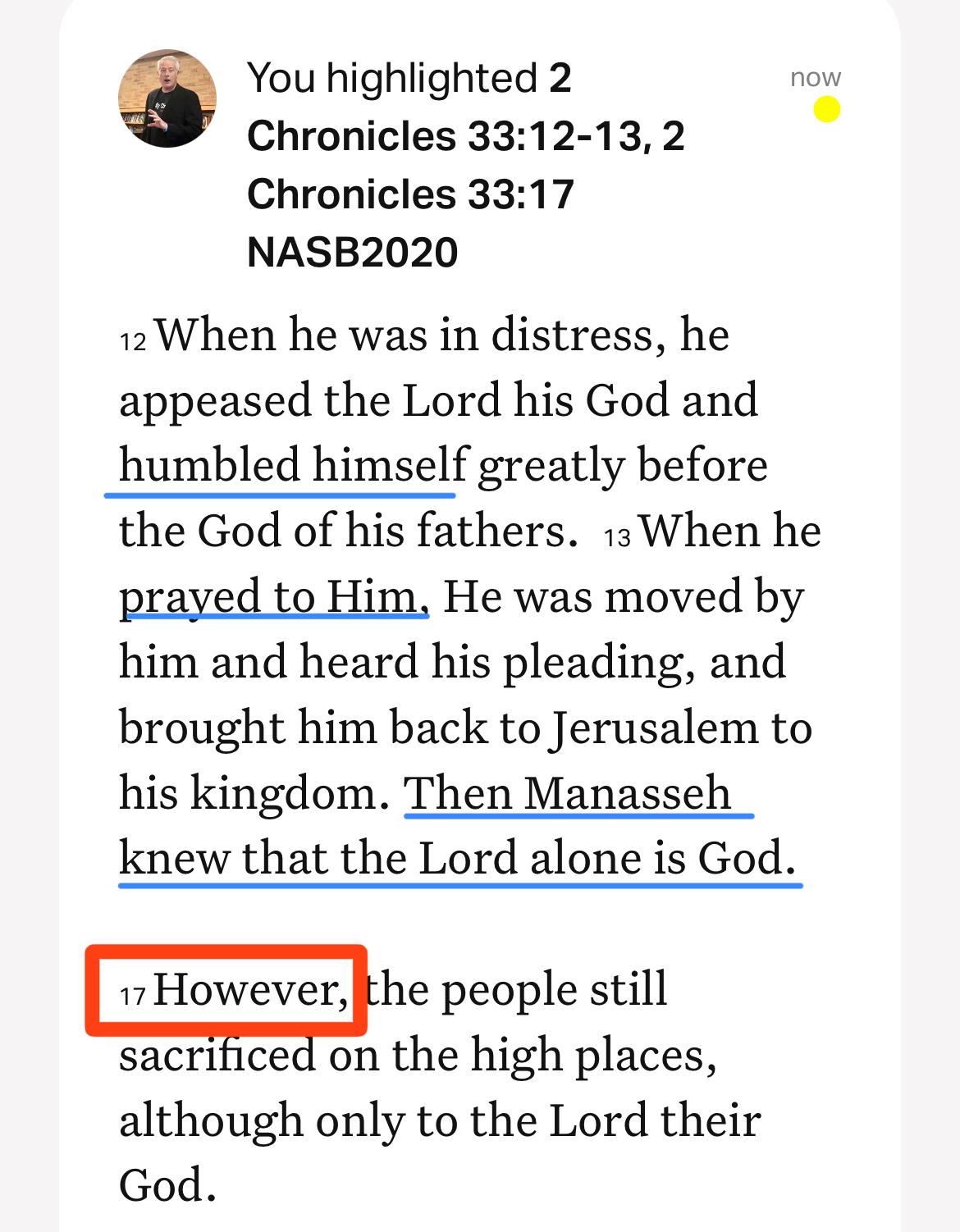 But there is a sad “however” for Manasseh’s son Amon: However, the people still sacrificed on the high places (2 Chronicles 33:17). This mixing of the worship of God with the worship of pagan idols always pulls people away from God. It certainly did that for Amon because “he did evil in the sight of the Lord, just as his father Manasseh had done. For he walked entirely in the way that his father had walked, and served the idols that his father had served, and worshiped them” (2 Kings 21:20-21). “Furthermore, he did not humble himself before the Lord as his father Manasseh had done, but Amon multiplied his guilt” (2 Chronicles 33:23).