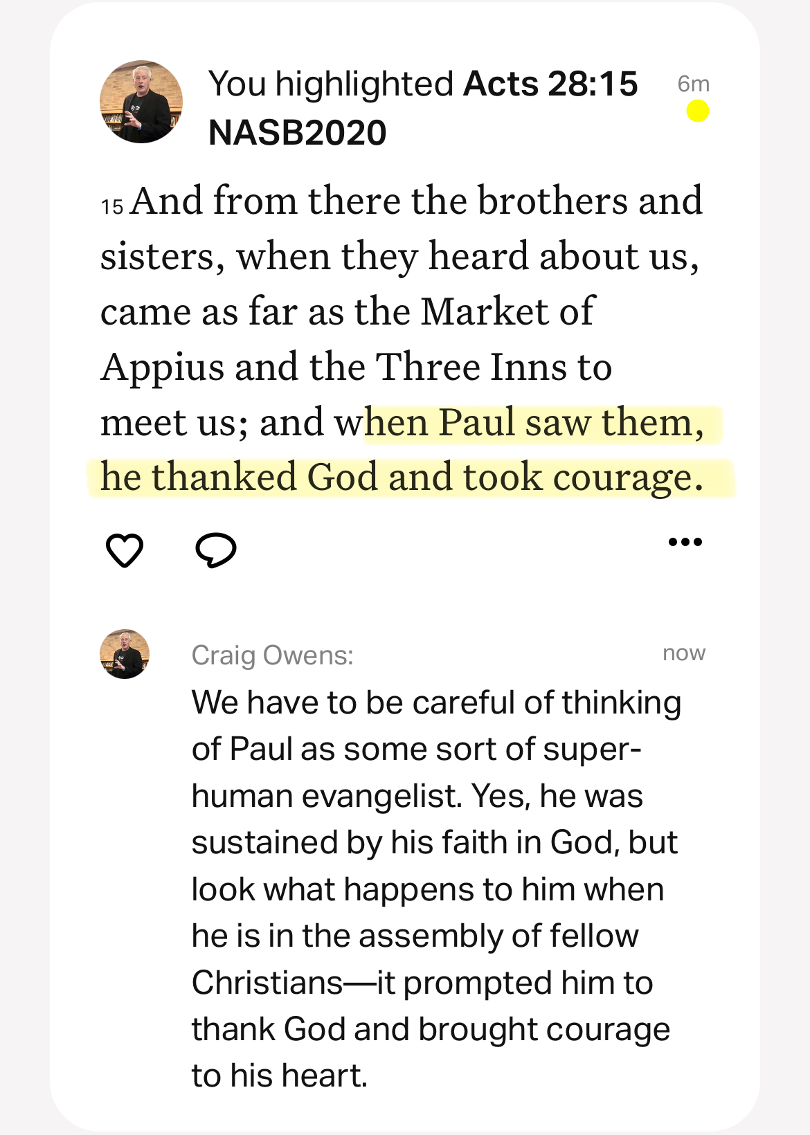 We have to be careful of thinking of Paul as some sort of super-evangelist. Yes, he was sustained by his faith in God, but look what happens to him when he is in the assembly of fellow saints—it prompted him to thank God and brought courage to his heart.