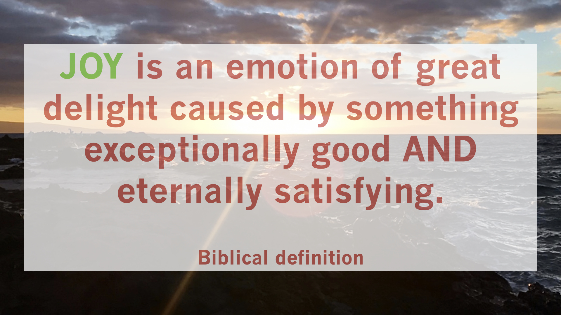 The English dictionary has the right definition for joy: the emotion of great delight caused by something exceptionally good or satisfying. Unfortunately, all of the examples the dictionary gives for joy are fleeting external things.