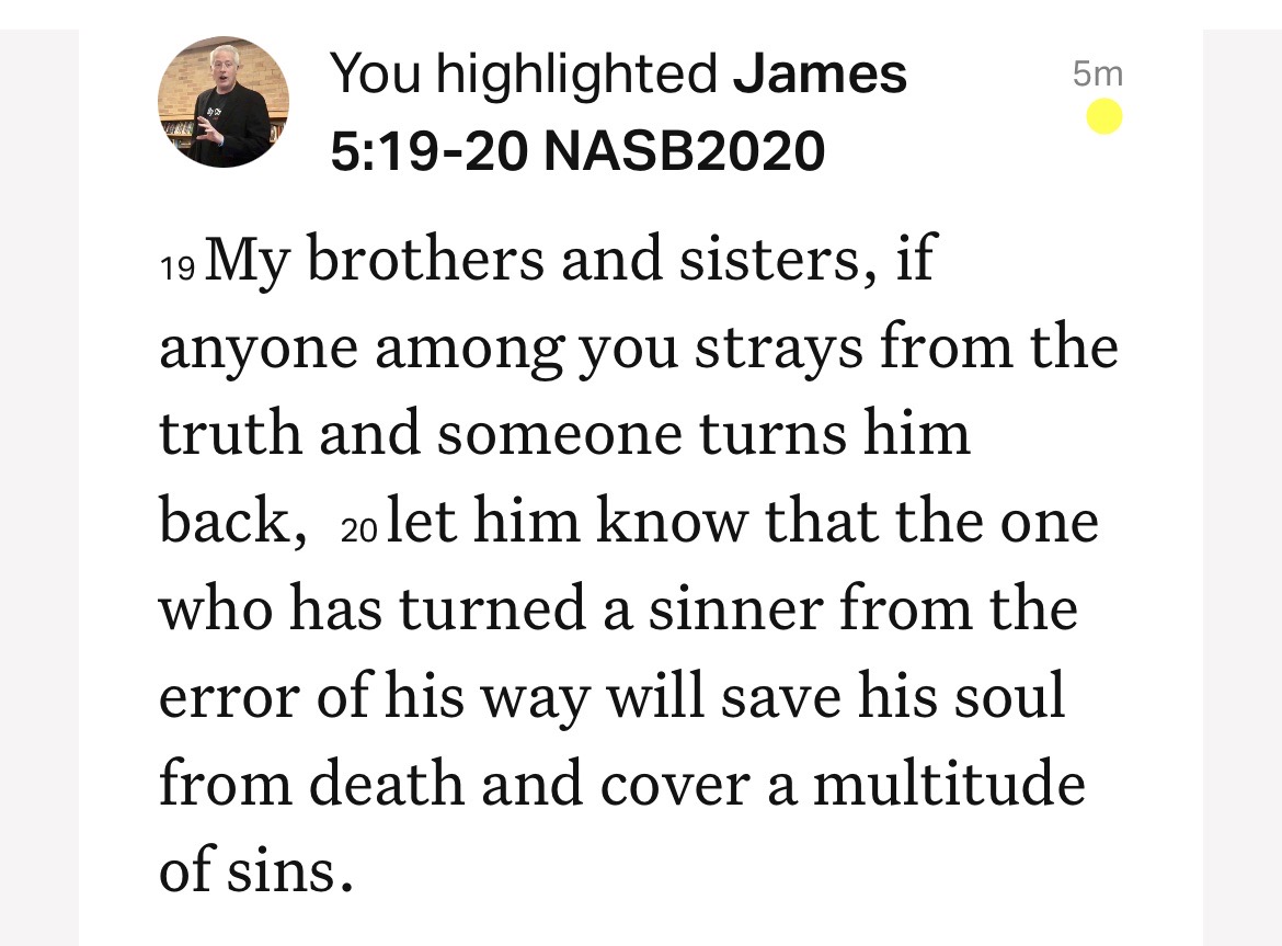 “Saints” is always plural in the Bible. That means we always need to be looking out for our brothers and sisters in Christ. I love the words James uses to close his letter to the saints.