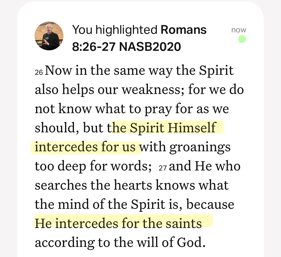 Now in the same way the Spirit also helps our weakness; for we do not know what to pray for as we should, but the Spirit Himself intercedes for us with groanings too deep for words; and He who searches the hearts knows what the mind of the Spirit is, because He intercedes for the saints according to the will of God. (Romans 8:26-27)