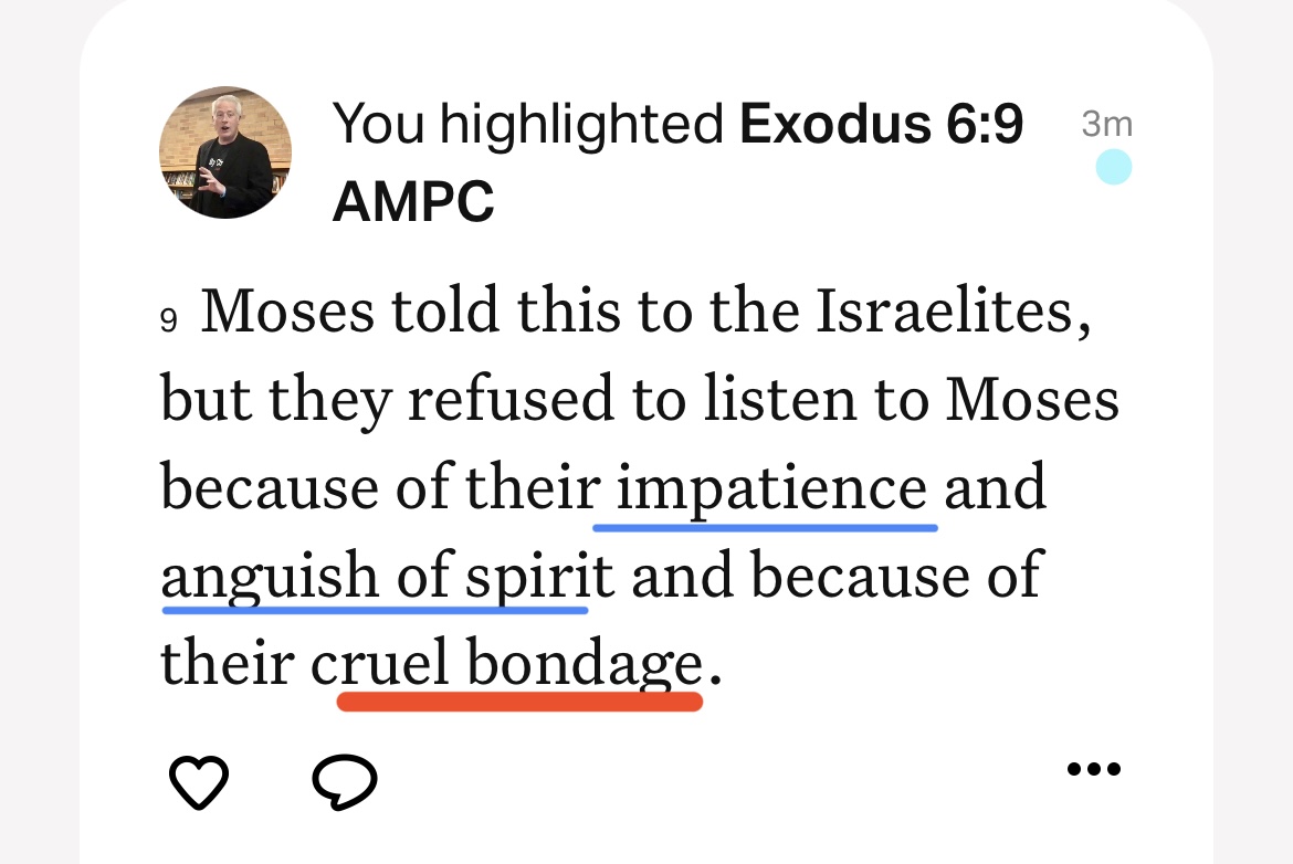 We may not be able to do anything about our external circumstances (“cruel bondage”), but can make sure that we are addressing what we can control. Both “impatience and anguish of spirit” are internal attitudes that we can change.