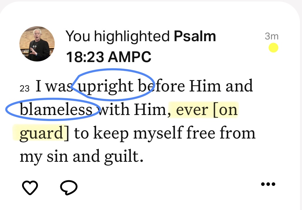 For I have kept the ways of the Lord and have not wickedly departed from my God. For all His ordinances were before me, and I put not away His statutes from me. I was upright before Him and blameless with Him, ever on guard to keep myself free from my sin and guilt. (Psalm 18:21-23 AMPC)