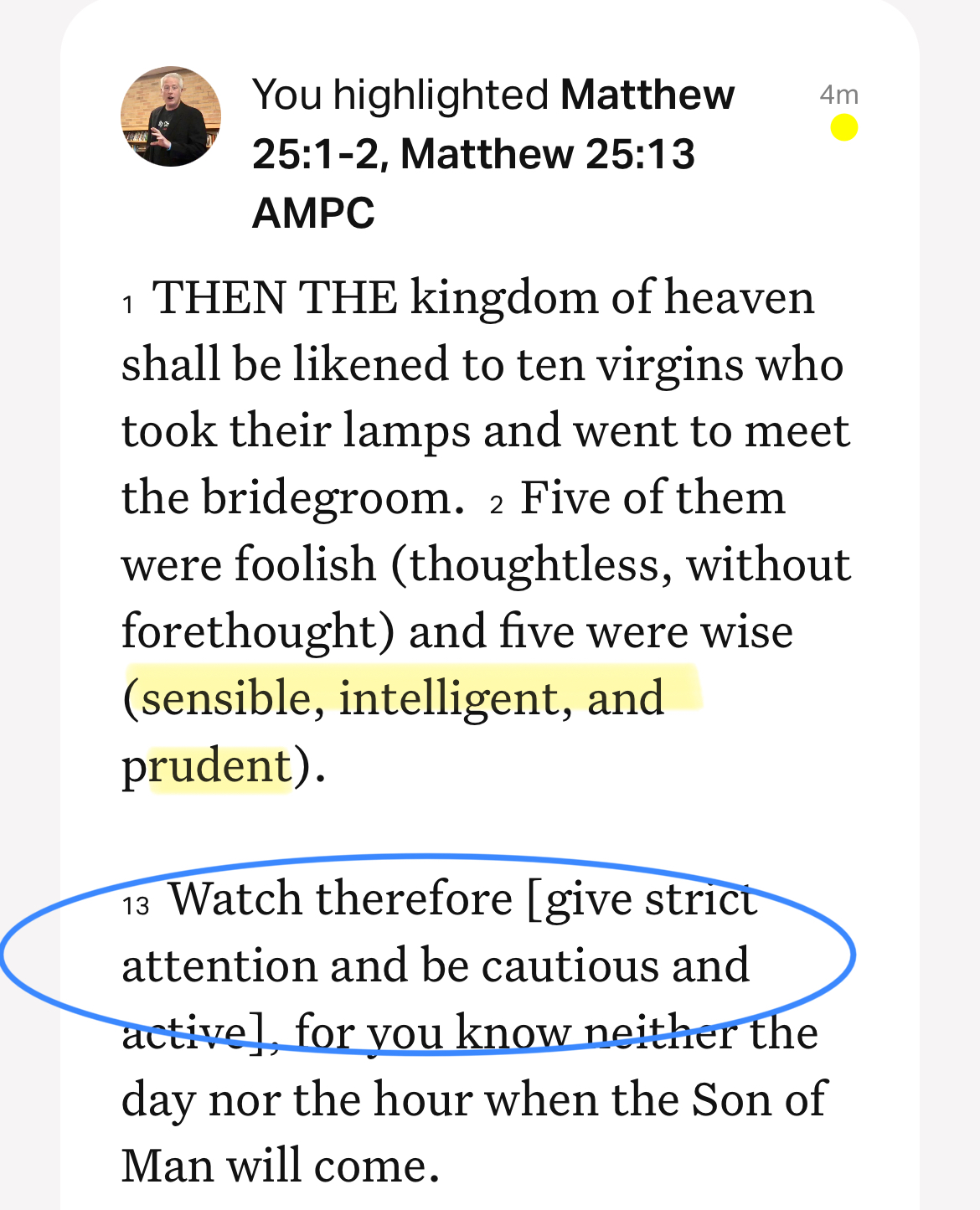 Then the kingdom of heaven shall be likened to ten virgins who took their lamps and went to meet the bridegroom. Five of them were foolish (thoughtless, without forethought) and five were wise (sensible, intelligent, and prudent). … Watch therefore [give strict attention and be cautious and active], for you know neither the day nor the hour when the Son of Man will come. (Matthew 25:1-2, 13)