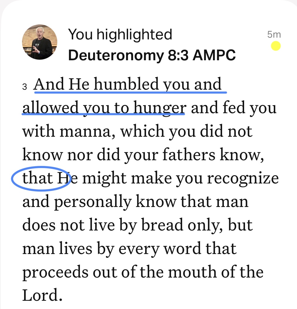 And [God] humbled you and allowed you to hunger and fed you with manna, which you did not know nor did your fathers know, that He might make you recognize and personally know that man does not live by bread only, but man lives by every word that proceeds out of the mouth of the Lord. … Know also in your [minds and] hearts that, as a man disciplines and instructs his son, so the Lord your God disciplines and instructs you. (Deuteronomy 8:3, 5 AMPC)