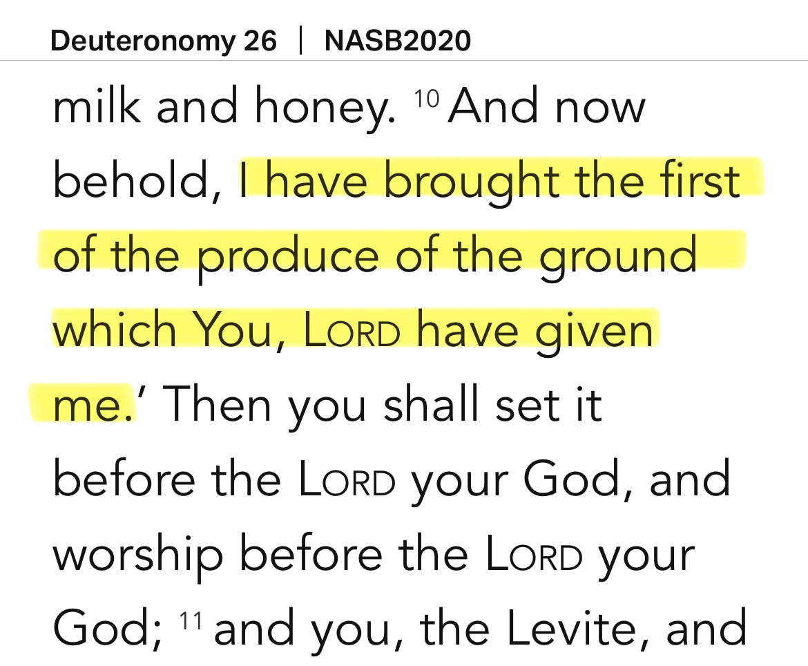 You shall take some of the first of all the produce of the soil which you harvest from the land the Lord your God gives you and put it in a basket, and go to the place [the sanctuary] which the Lord your God has chosen as the abiding place for His Name [and His Presence]. And you shall go to the priest who is in office in those days, and say to him, “I give thanks this day to the Lord your God that I have come to the land which the Lord swore to our fathers to give us. … And now, behold, I bring the firstfruits of the ground which You, O Lord, have given me.” And you shall set it down before the Lord your God and worship before the Lord your God. (Deuteronomy 26:2-3, 10 AMPC)