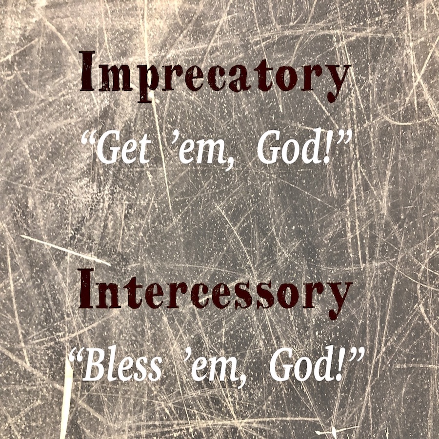 Imprecatory prayers are, “Get ’em, God!” prayers. Intercessory prayers are, “Bless ’em, God!” prayers.