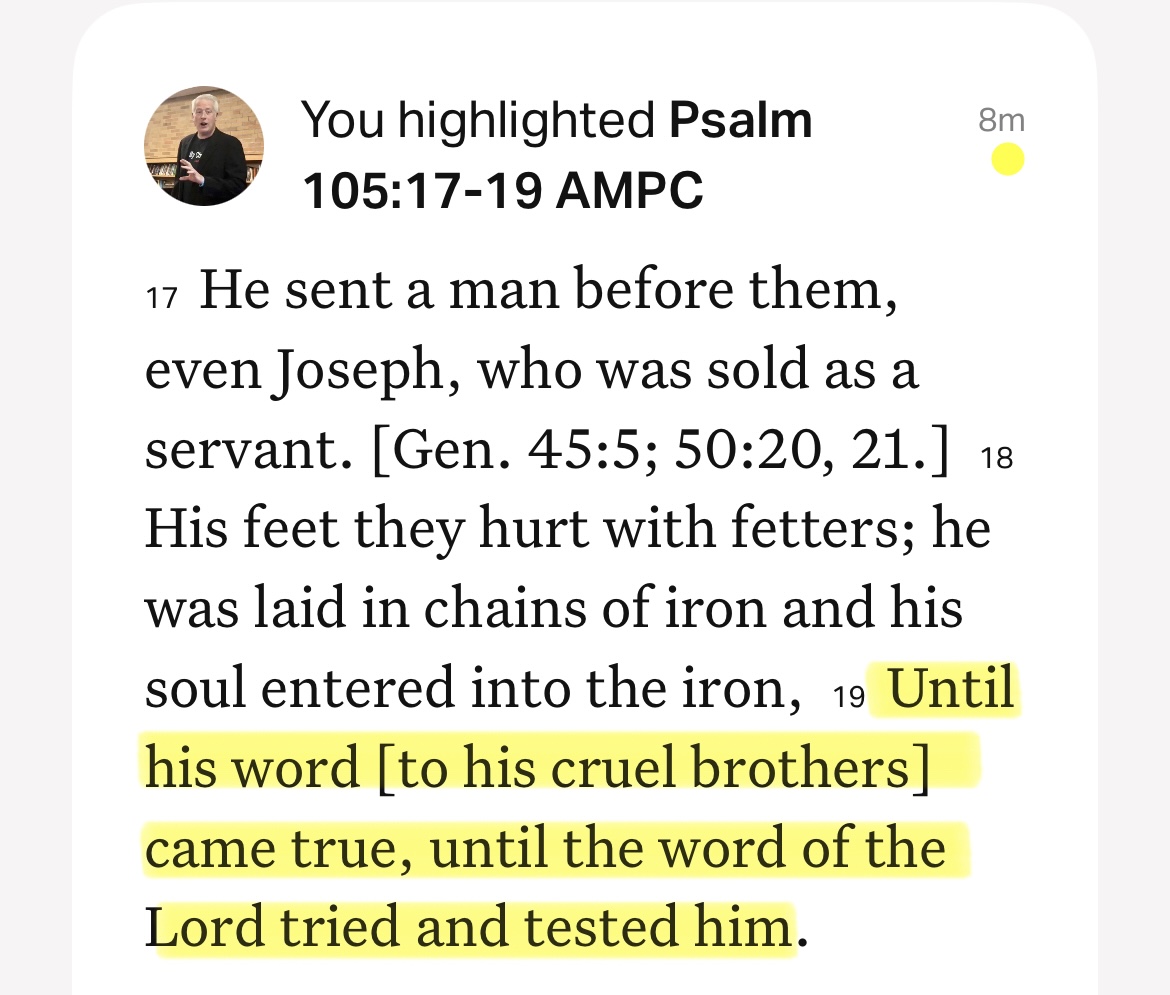Moreover, [God] called for a famine upon the land of Egypt; He cut off every source of bread [Genesis 41:54]. He sent a man before them, even Joseph, who was sold as a servant [Genesis 45:5; 50:20, 21]. His feet they hurt with fetters; he was laid in chains of iron and his soul entered into the iron, until his word to his cruel brothers came true, until the word of the Lord tried and tested him. The king sent and loosed him, even the ruler of the peoples, and let him go free. He made Joseph Lord of his house and ruler of all his substance [Genesis 41:40]. To bind his princes at his pleasure and teach his elders wisdom. (Psalm 105:16-22 AMPC)