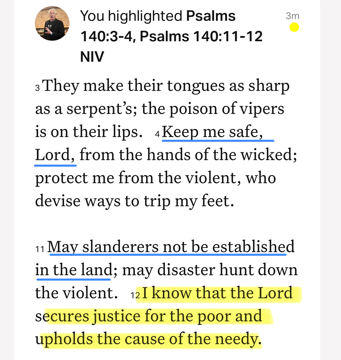 Keep me safe, Lord, from the hands of the wicked; protect me from the violent, who devise ways to trip my feet. … May slanderers not be established in the land; may disaster hunt down the violent. I know that the Lord secures justice for the poor and upholds the cause of the needy. (Psalm 140:4, 11-12)
