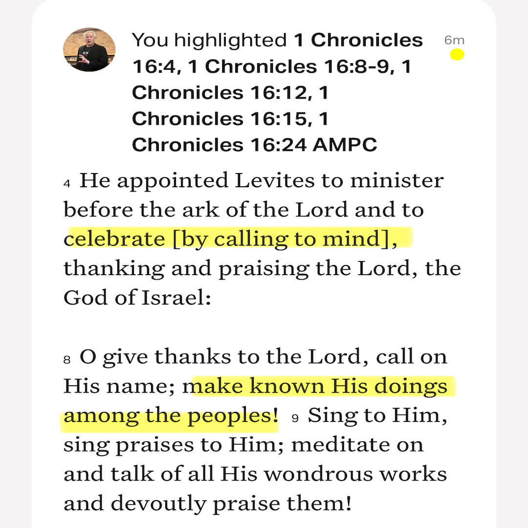 [King David] appointed Levites to minister before the ark of the Lord and to celebrate by calling to mind, thanking and praising the Lord, the God of Israel: … O give thanks to the Lord, call on His name; make known His doings among the peoples! Sing to Him, sing praises to Him; meditate on and talk of all His wondrous works and devoutly praise them! … Earnestly remember the marvelous deeds which He has done, His miracles, and the judgments He uttered as in Egypt. … Be mindful of His covenant forever, the promise which He commanded and established to a thousand generations. … Declare His glory among the nations, His marvelous works among all peoples. (1 Chronicles 16:4, 8-9, 12, 15, 24 AMPC)