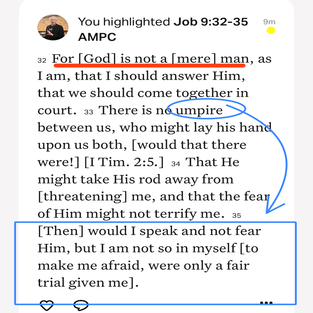 For God is not a mere man, as I am, that I should answer Him, that we should come together in court. There is no umpire between us, who might lay his hand upon us both—would that there were! That He might take His rod away from threatening me, and that the fear of Him might not terrify me. Then would I speak and not fear Him, but I am not so in myself to make me afraid, were only a fair trial given me. (Job 9:32-35 AMPC)