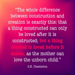 G.K. Chesterton wrote, “The whole difference between construction and creation is exactly this: that a thing constructed can only be loved after it is constructed; but a thing created is loved before it exists, as the mother can love the unborn child.”