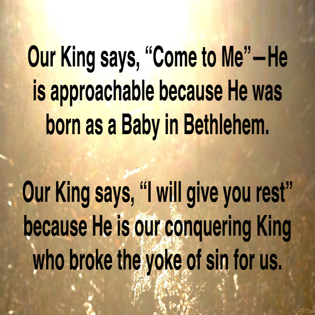 Our King says, “Come to Me”—He is approachable because He was born as a Baby in Bethlehem. Our King says, “I will give you rest” because He is our conquering King who broke the yoke of sin for us. This is what Christmas should remind us!