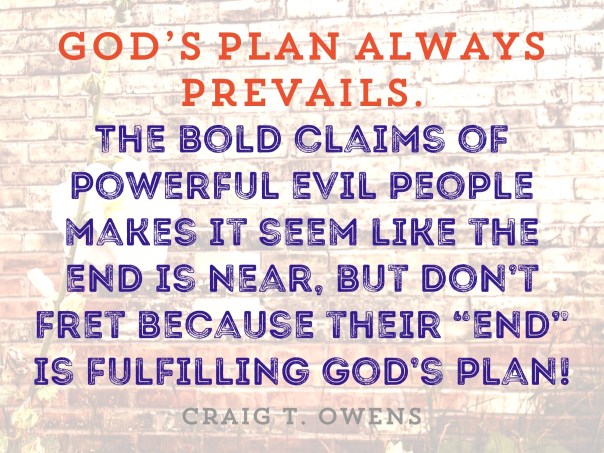 Let me say it again: God’s plan always prevails. The bold claims of powerful evil people may make it seem like the end is near, but don’t fret because their “end” is only fulfilling God’s plan!