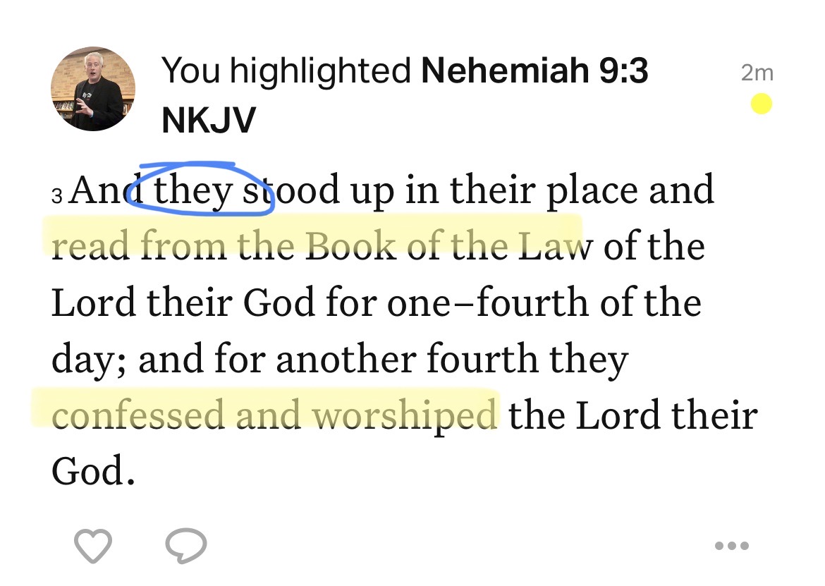 And they stood up in their place and read from the Book of the Law of the Lord their God for one-fourth of the day; and for another fourth they confessed and worshiped the Lord their God. (Nehemiah 9:3)