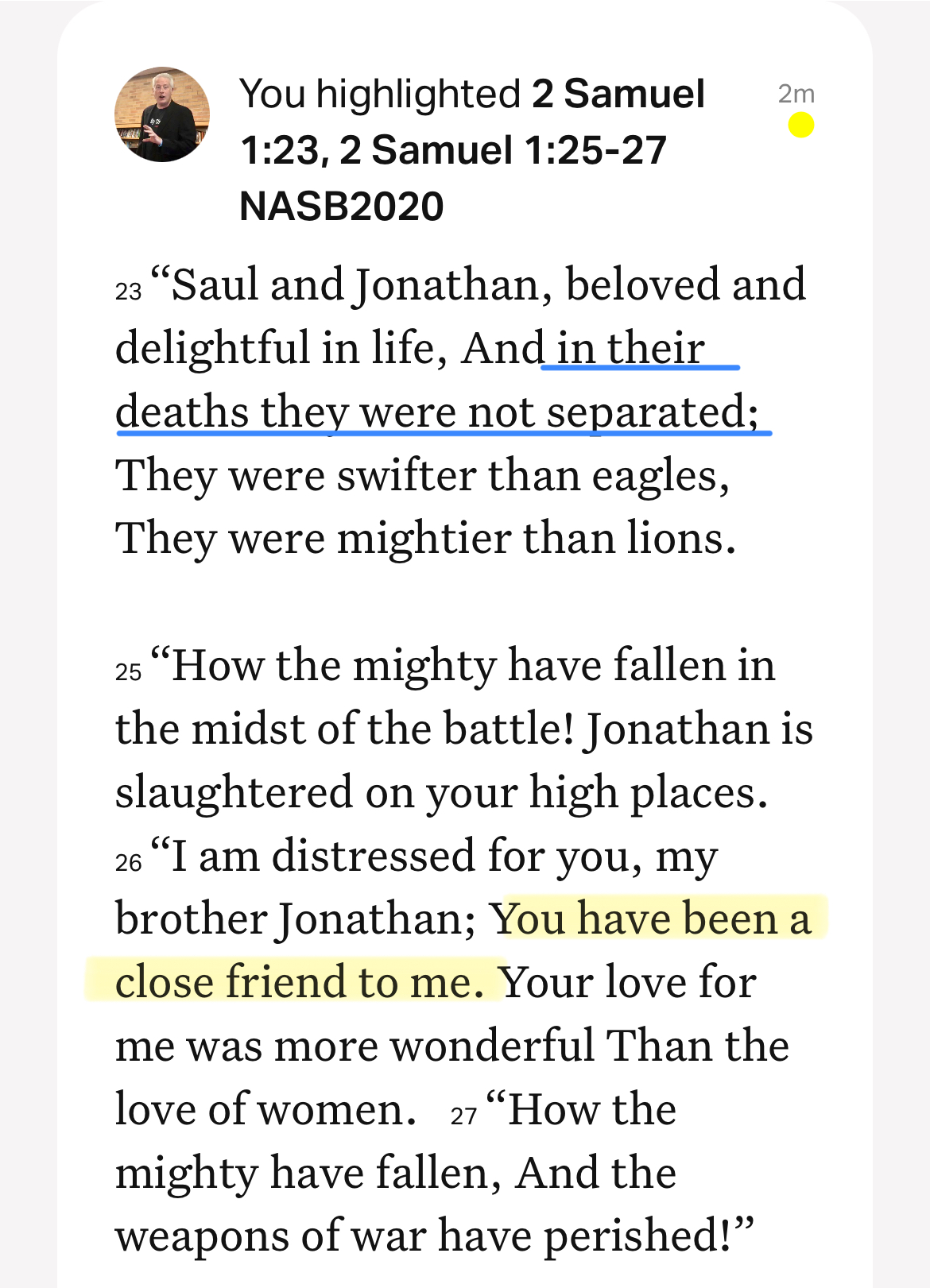 Saul and Jonathan, beloved and delightful in life, and in their deaths they were not separated; they were swifter than eagles, they were mightier than lions. Daughters of Israel, weep over Saul, who clothed you in scarlet, with jewelry, who put gold jewelry on your apparel. How the mighty have fallen in the midst of the battle! Jonathan is slaughtered on your high places. I am distressed for you, my brother Jonathan; you have been a close friend to me. Your love for me was more wonderful than the love of women. How the mighty have fallen, and the weapons of war have perished! (2 Samuel 1:23-27)