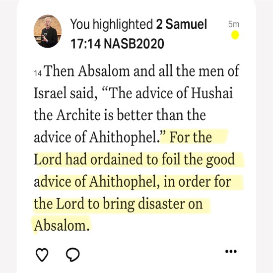 Absalom and all the men of Israel said, “The advice of Hushai the Arkite is better than that of Ahithophel.” For the Lord had determined to frustrate the good advice of Ahithophel in order to bring disaster on Absalom. (2 Samuel 16:20; 17:1-7, 14).