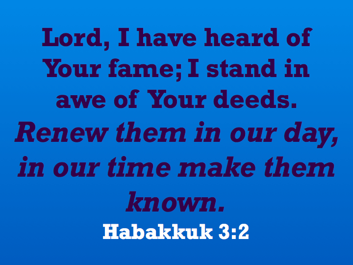 Lord, I have heard of Your fame; I stand in awe of Your deeds, O Lord. Renew them in our day, in our time make them known. (Habakkuk 3:2)
