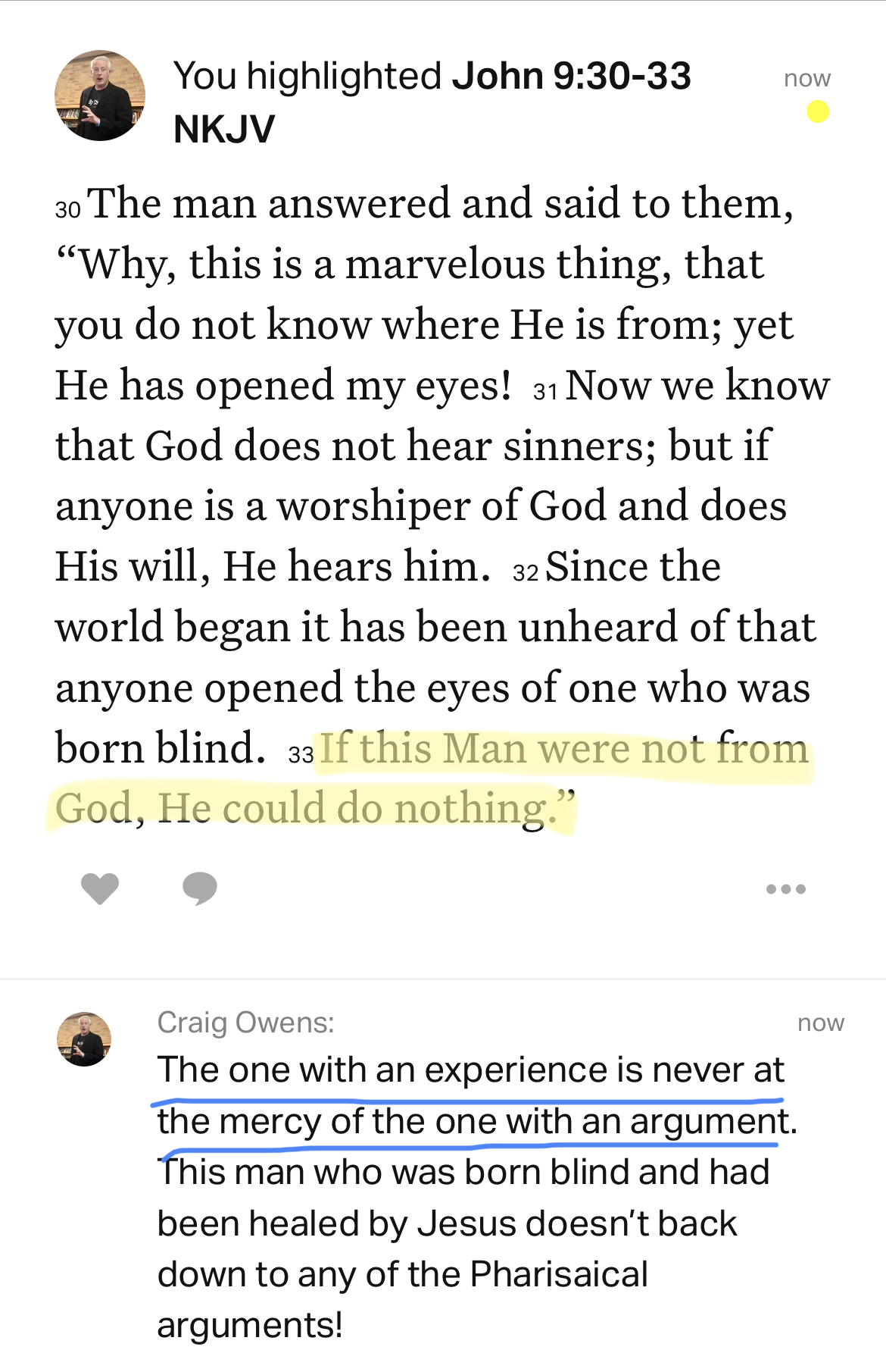 Those with a personal experience of Christ’s life-changing power (like this former blind man) are never at the mercy of those with an argument (like the Pharisees).