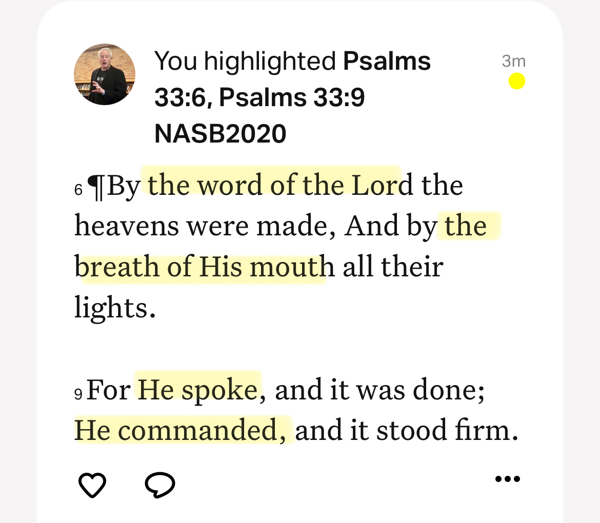 By the word of the Lord the heavens were made, and by the breath of His mouth all their lights. … For He spoke, and it was done; He commanded, and it stood firm. (Psalm 33:6, 9)