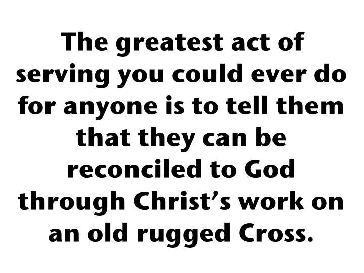 The greatest act of serving you could ever do for anyone is telling them that they can be reconciled to God through Jesus Christ’s work on an old rugged Cross!