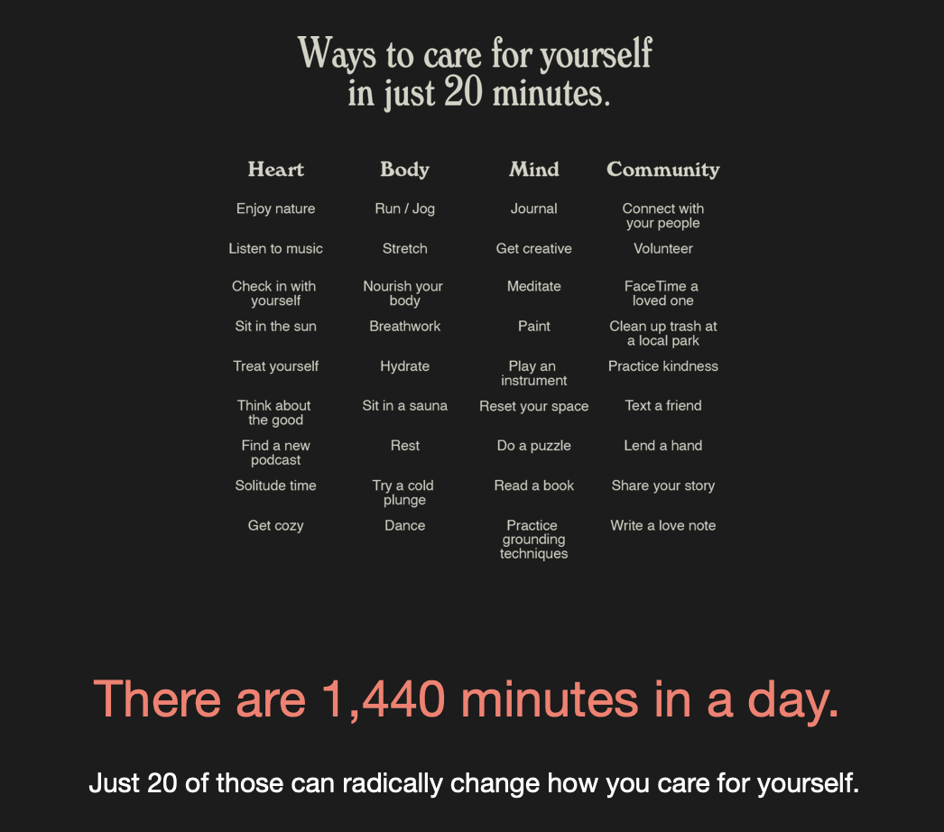Self-care is vital. Without taking care of yourself first, how will you have any strength to take care of others? To Write Love On Her Arms has a helpful list of self-care items you can do in just 20 minutes per day.