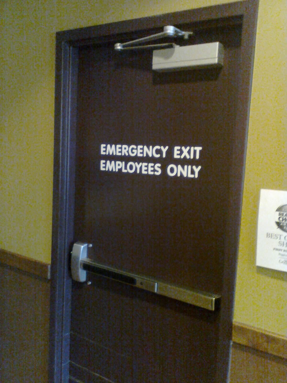 But when I put the two parts together, it struck me funny. “Are they saying only employees can use the emergency exit? What happens to the rest of us?”
