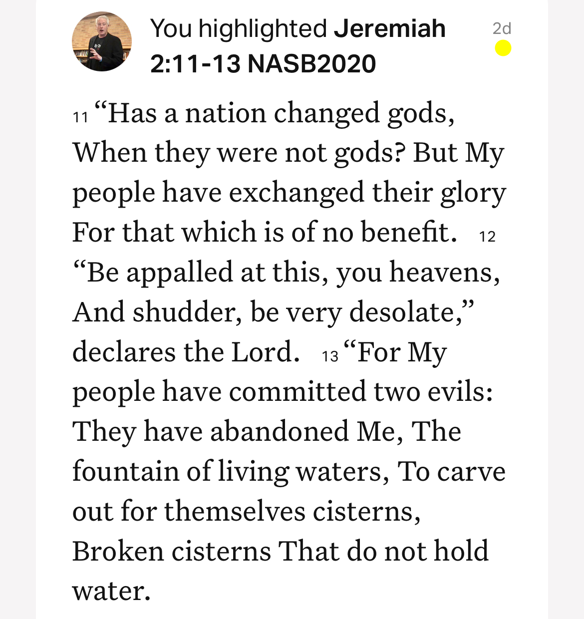 “Has a nation changed gods, when they were not gods? But My people have exchanged their glory for that which is of no benefit.Be appalled at this, you heavens, and shudder, be very desolate,” declares the Lord.“For My people have committed two evils: They have abandoned Me, the fountain of living waters, to carve out for themselves cisterns, broken cisterns that do not hold water. … Your own wickedness will correct you, and your apostasies will punish you; know therefore and see that it is evil and bitter for you to abandon the Lord your God, and the fear of Me is not in you,” declares the Lord God of armies. (Jeremiah 2:11-13, 19)