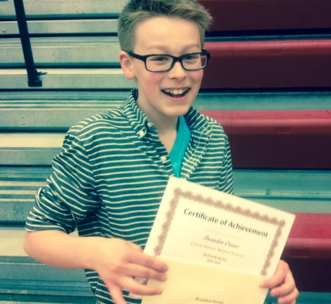 The essay contest is for the entire 5th grade in Cedar Springs, where they are asked to write about someone who shows integrity. I’ve known for a couple of weeks that Brandon was one of only five winner selected, but he has carefully guarded his essay. Today at lunch was the first time either Betsy or I heard it.