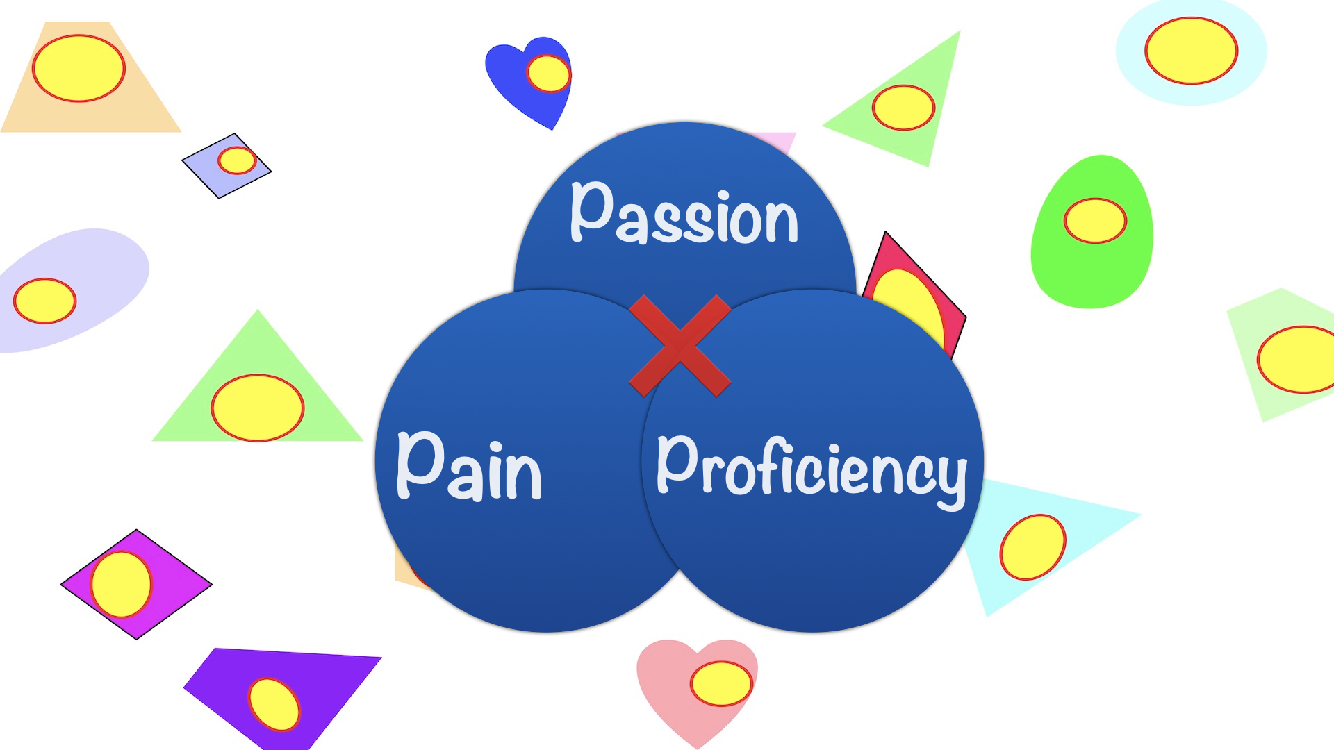 So let’s add one more circle to the passion and pain circles, and that is the circle of proficiency. This is what fulfills us because we can do it so well; it feels so natural for us to be doing this. Proficiency is what really brings together the passion and the pain, and it helps us find the sweet spot.