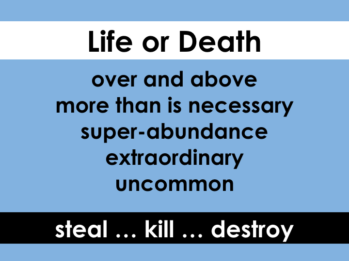 The choice is yours: the rip-off, destruction, and death the devil offers OR the abundant, overflowing, extraordinary, more-than-is-needed, zoe life that Jesus offers.