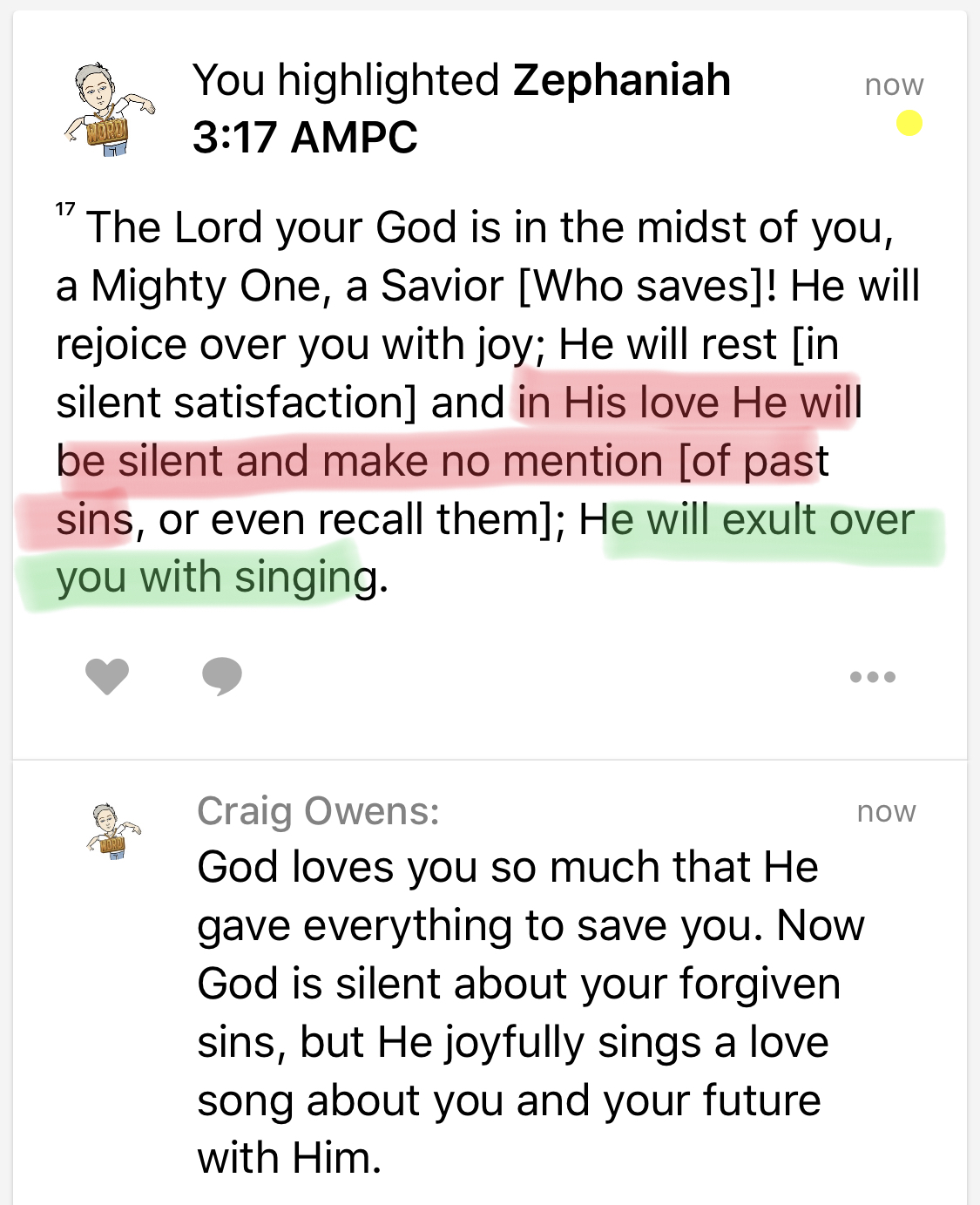 November 8, 2018 — Craig T. OwensI’ve always loved this verse about God singing over me! I noticed something interesting in the Amplified Bible—not only God’s singing, but His silence. He is silent (making no mention) about my forgiven sins, but He sings His love about my future with Him.