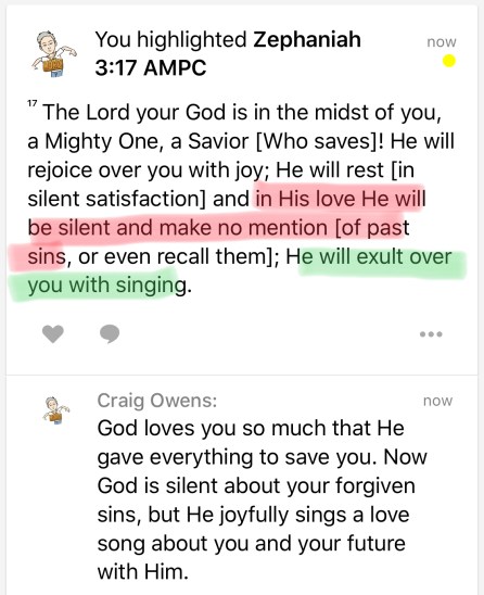 I’ve always loved this verse about God singing over me! I noticed something interesting in the Amplified Bible—not only God’s singing, but His silence. He is silent (making no mention) about my forgiven sins, but He sings His love about my future with Him.